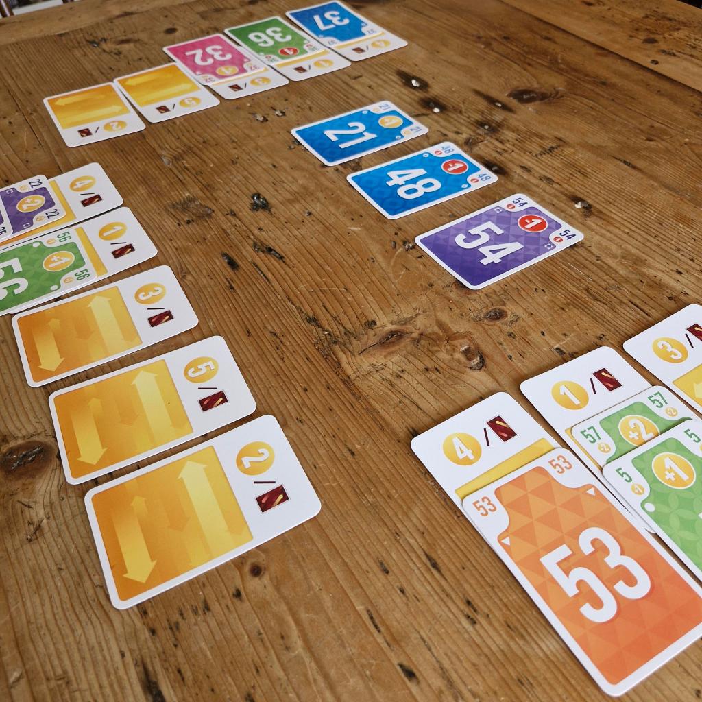 These elements make for a really very interesting nugget of a game. In several respects this really feels similar to the rather great 6Nimmt, which interestingly also comes with exactly 104 cards? Both games utilise the system whereby each turn is taken simultaneously with all players each selecting a card from their hands keeping it face down and then all revealing together, which obviously has a big element of luck but also a large degree of considered judgement. You can see where the others players will probably be placing their blind bid, you can’t be absolutely sure but judging it right is tense and a lovely feeling.