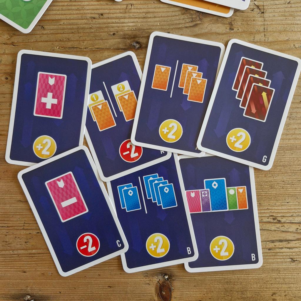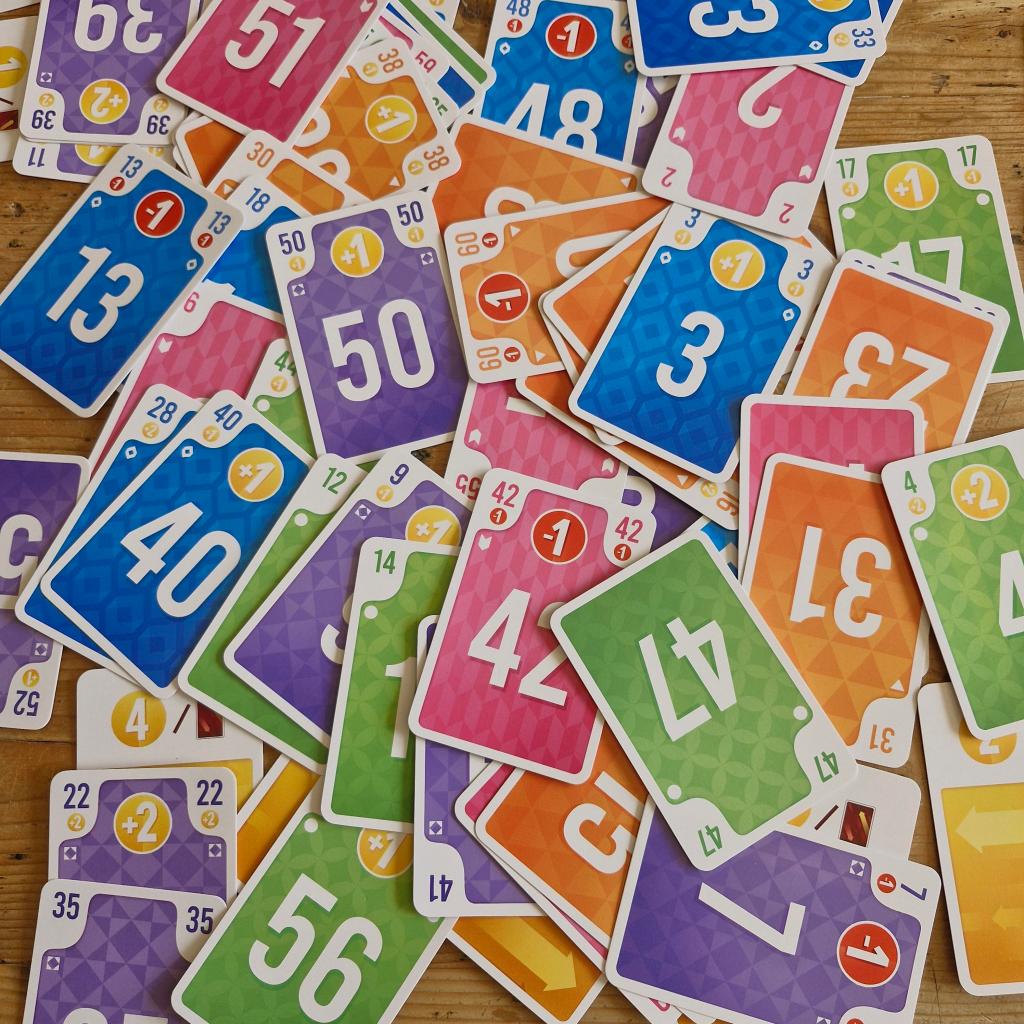 Right so what do we have in the box? Well according to the very nicely written and designed instructions we get cards, 104 of them to be precise. These are broken into three groups, sixty main cards numbered from 1 to 60 divided into five different colours with twelve cards in each group. You then have thirty scoring cards, five for each player numbered 1 to 5, that’s right this game plays up to a hefty six people. Then finally fourteen bonus objectives which we’ll come to later.
