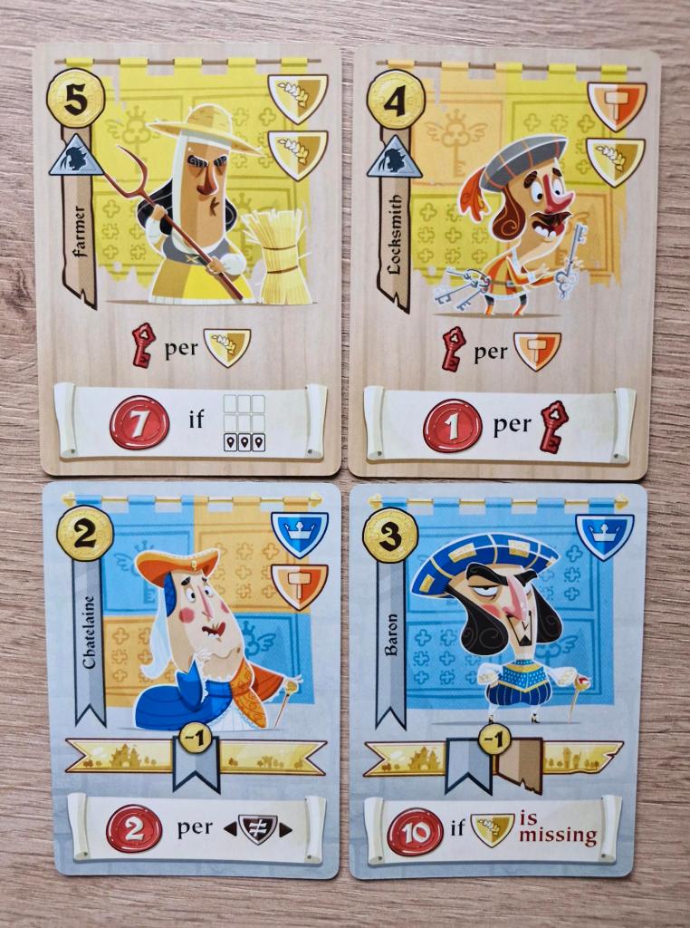 So let’s summarise exactly what is going on here. Castle Combo is a tableau builder, you’ll be purchasing cards from a display in the middle of the table and creating a three by three grid of those cards in front of you. The trickiness of the purchasing decision in this game is actually two layered as the card you choose will give you some sort of instant reward like more money or keys, more on keys later, but will also have an end of game scoring opportunity often dependant on the placement of the card itself and those around it. Additionally each card will have symbols on it in the form of coloured shields that tie into end of game scoring but also can help to enhance the instant reward from other cards taken.