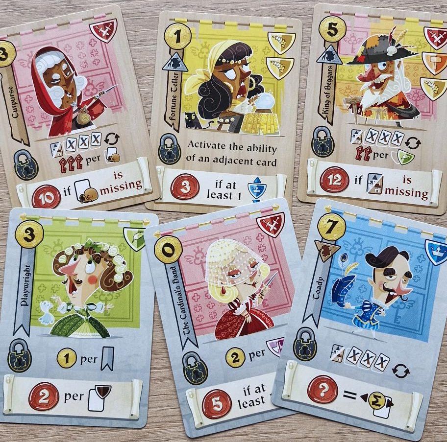 So what are these new cards and how do they change the game? The expansion contains twelve new cards, six for each deck, which function in very much the same way as the standard cards with different coloured shields and end game scoring criteria, which are slightly different here having the emphasis on the value of cards around it to define how many victory points it generates.