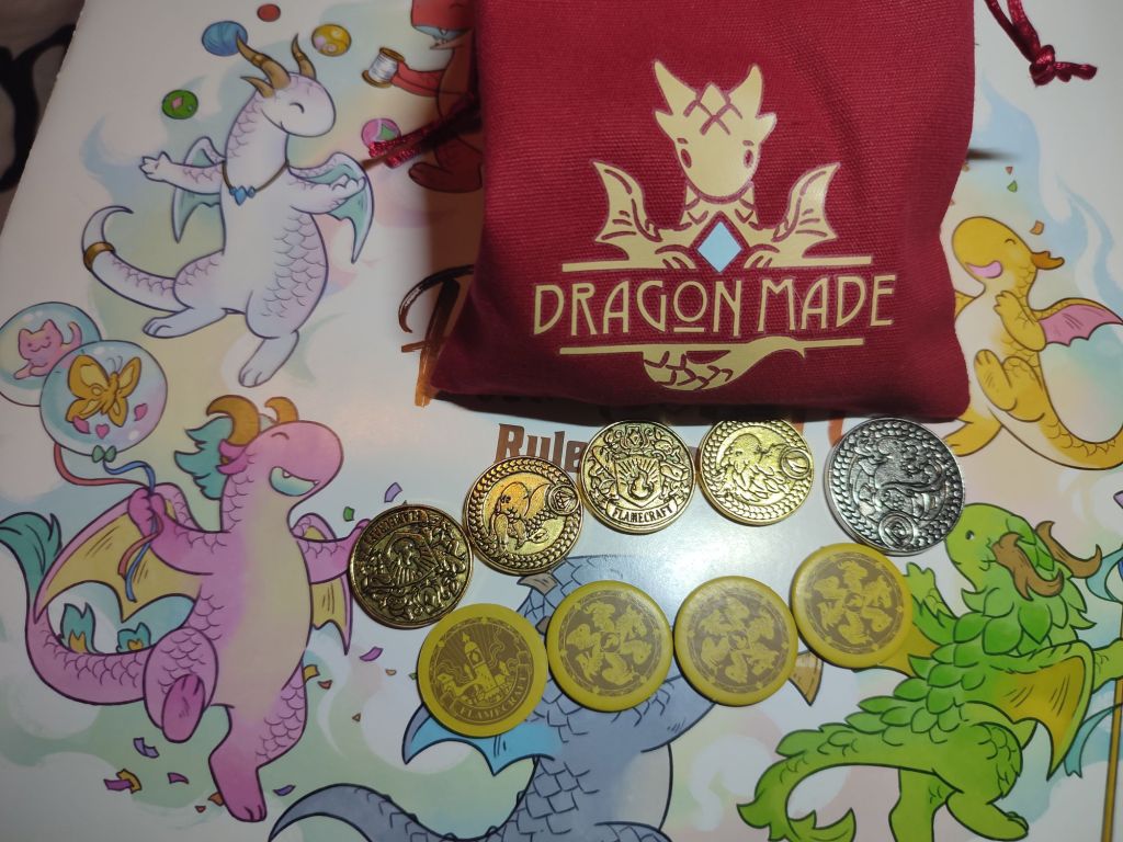 Metal coins and bag, with a bonus silver coin. Boring cardboard ones underneath. With Kickstarter I have been prone to deluxe editions where affordable, such as Canvas, but that’s for another post. 😉